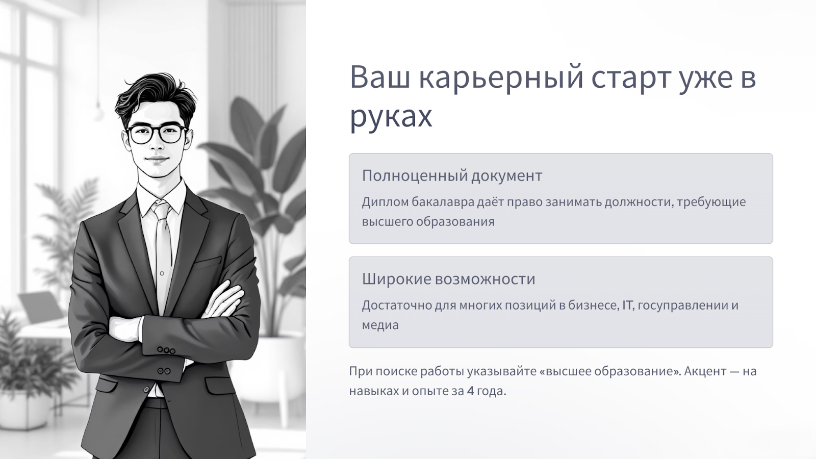 Диплом бакалавра — это ваш пропуск в мир профессий, требующих высшего образования. Вы сможете работать: