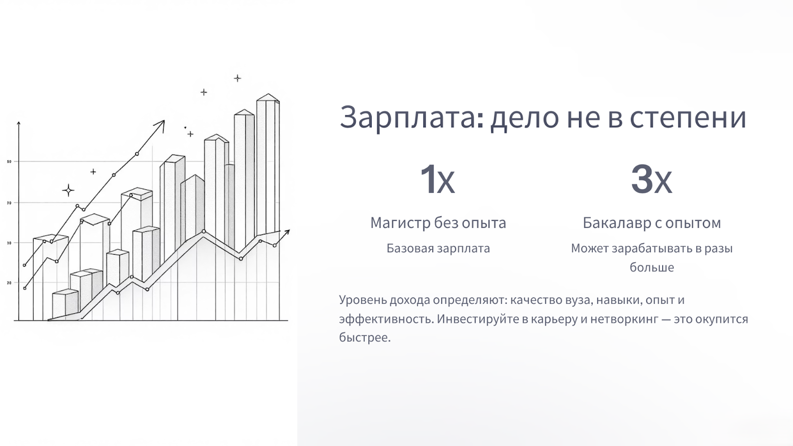 Уровень вашей стартовой зарплаты будет зависеть от множества факторов: престижа вашего вуза, ваших личных компетенций (включая знание иностранных языков и владение дополнительными программами), наличия портфолио (для творческих и IT-специальностей), опыта практик и стажировок, а также от географии и аппетитов конкретной компании. Выпускник-бакалавр сильного столичного вуза с отличным знанием английского и несколькими реализованными проектами может зарабатывать значительно больше магистра из периферийного вуза без практического опыта.