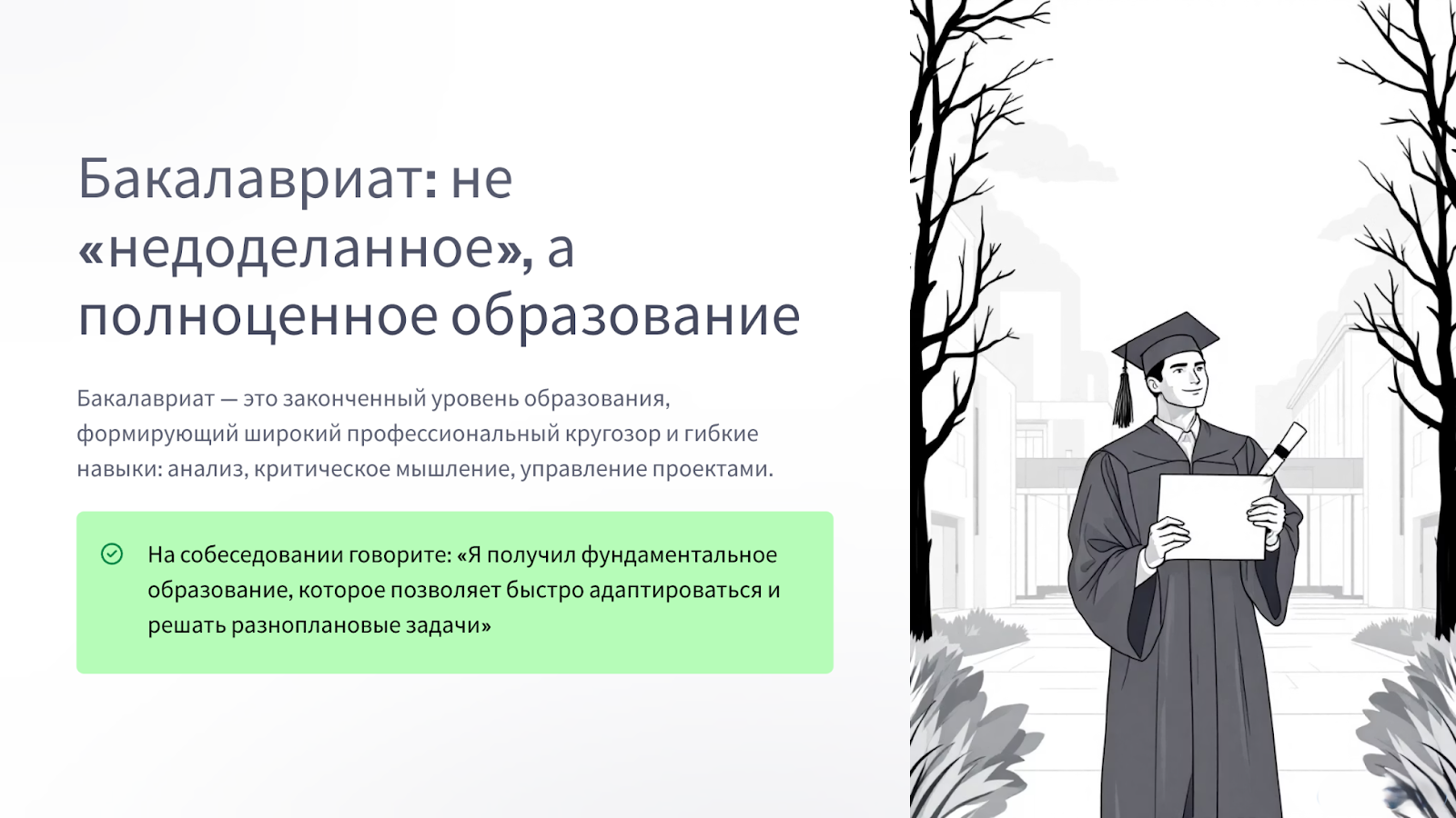 Для многих позиций, особенно в коммерческом секторе, этого уровня достаточно. Работодатели часто ценят именно базовые знания, гибкость мышления и потенциал, которые дает бакалавриат, а узким специализациям предпочитают обучать сотрудников под свои конкретные задачи.