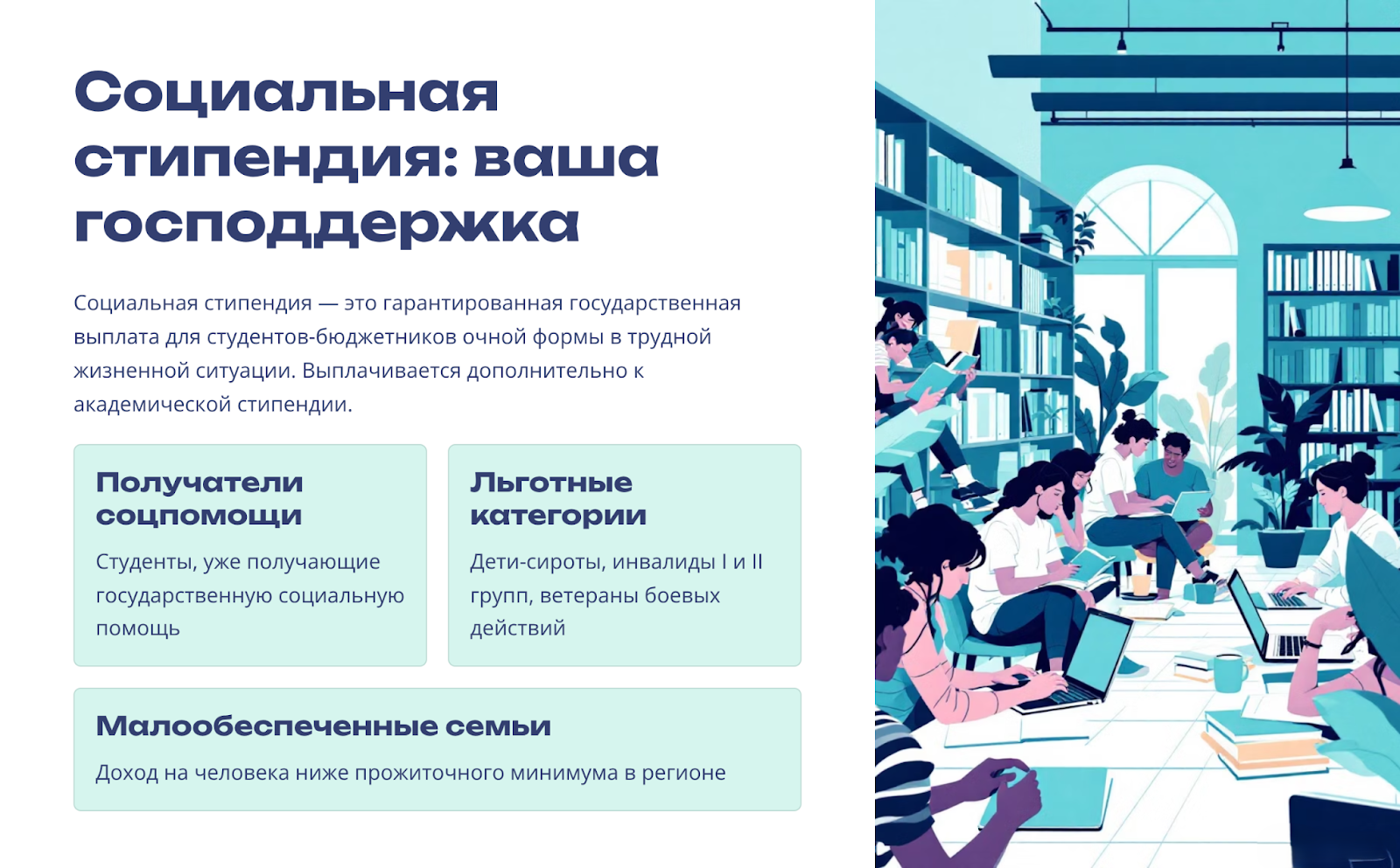 Важно понимать, что социальная стипендия — это не обычная академическая выплата, которая зависит от успеваемости. Это мера государственной поддержки для студентов, оказавшихся в сложной финансовой ситуации. Право на её получение имеют студенты, являющиеся гражданами России и обучающиеся по очной форме за счет бюджетных ассигнований.
