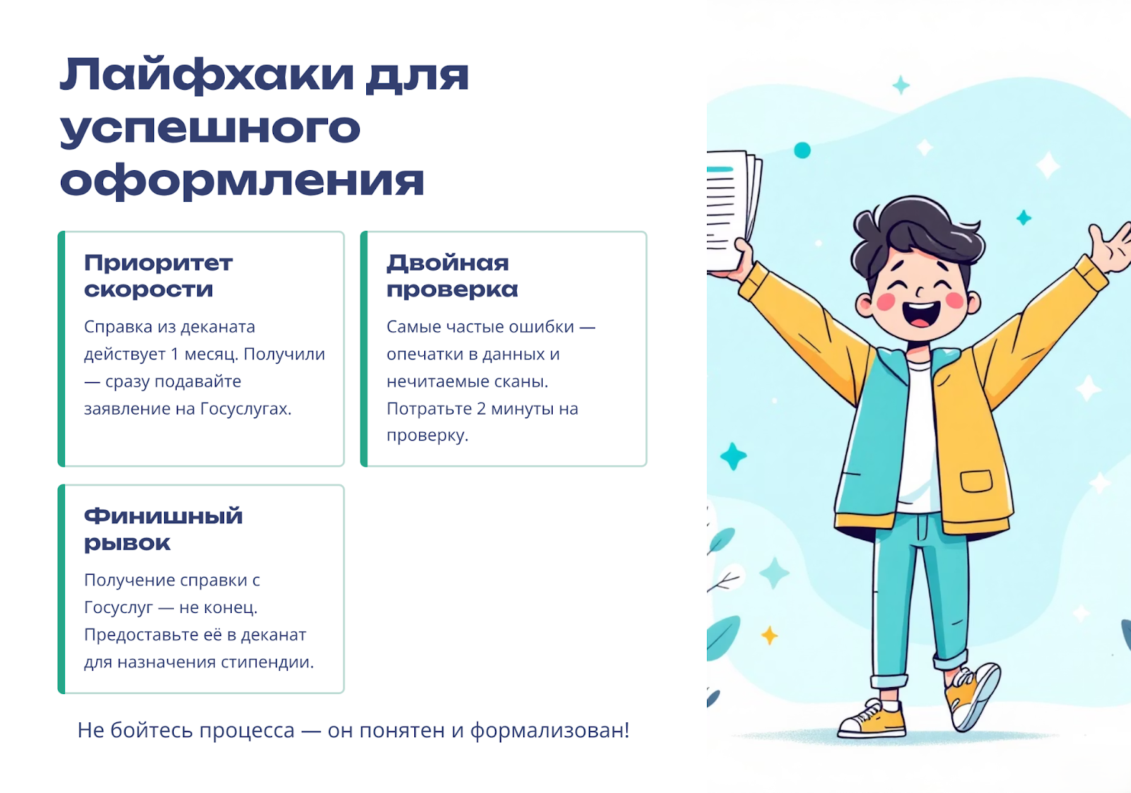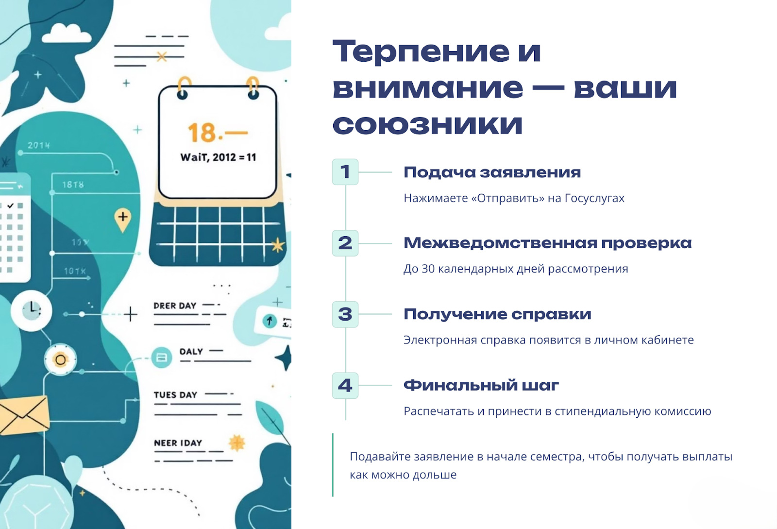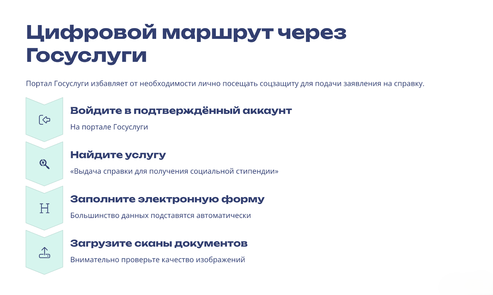Прежде чем переходить к подаче заявления на Госуслугах, необходимо получить ключевой документ — справку о получении государственной социальной помощи. Именно она является основанием для назначения социальной стипендии.