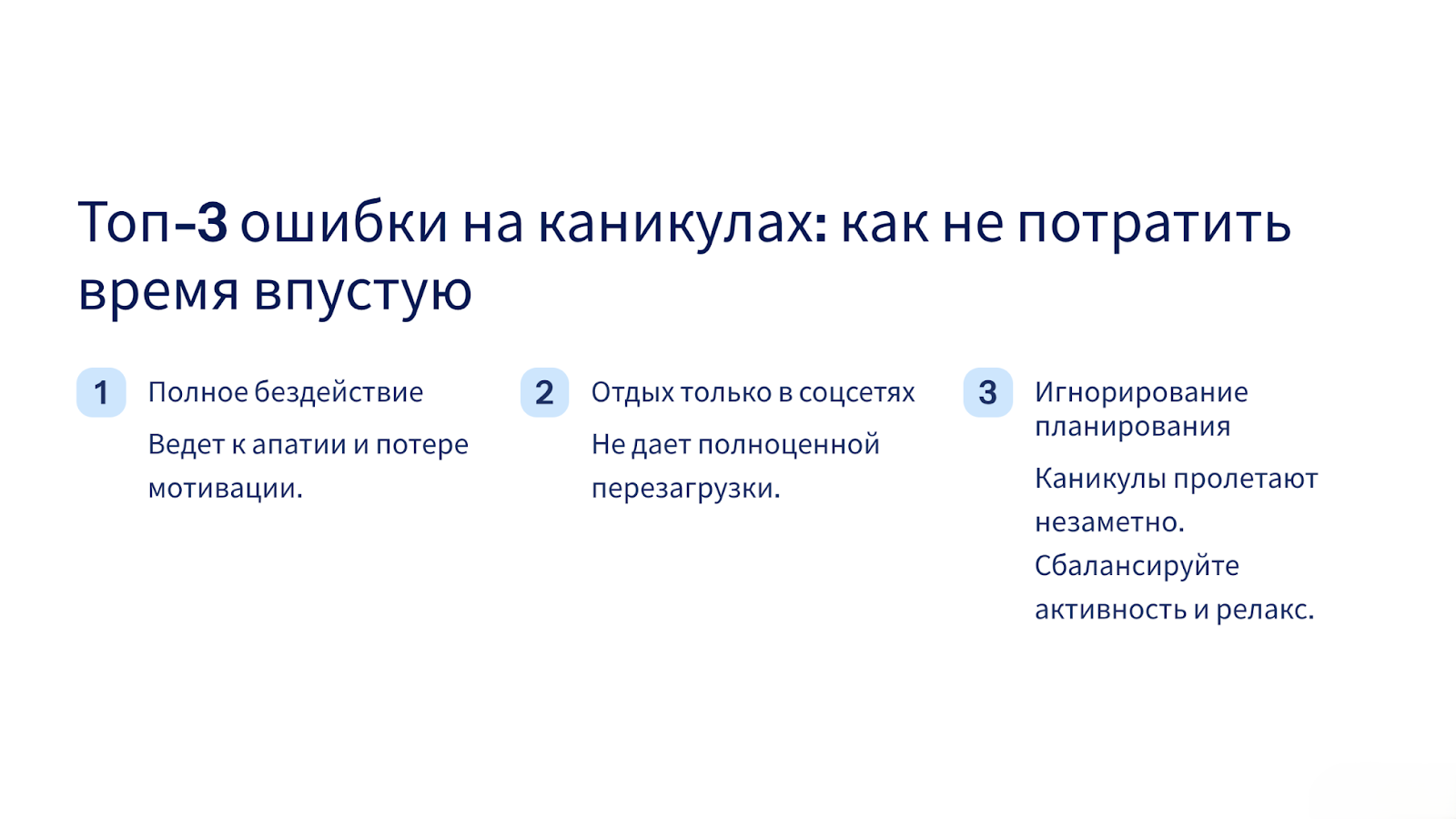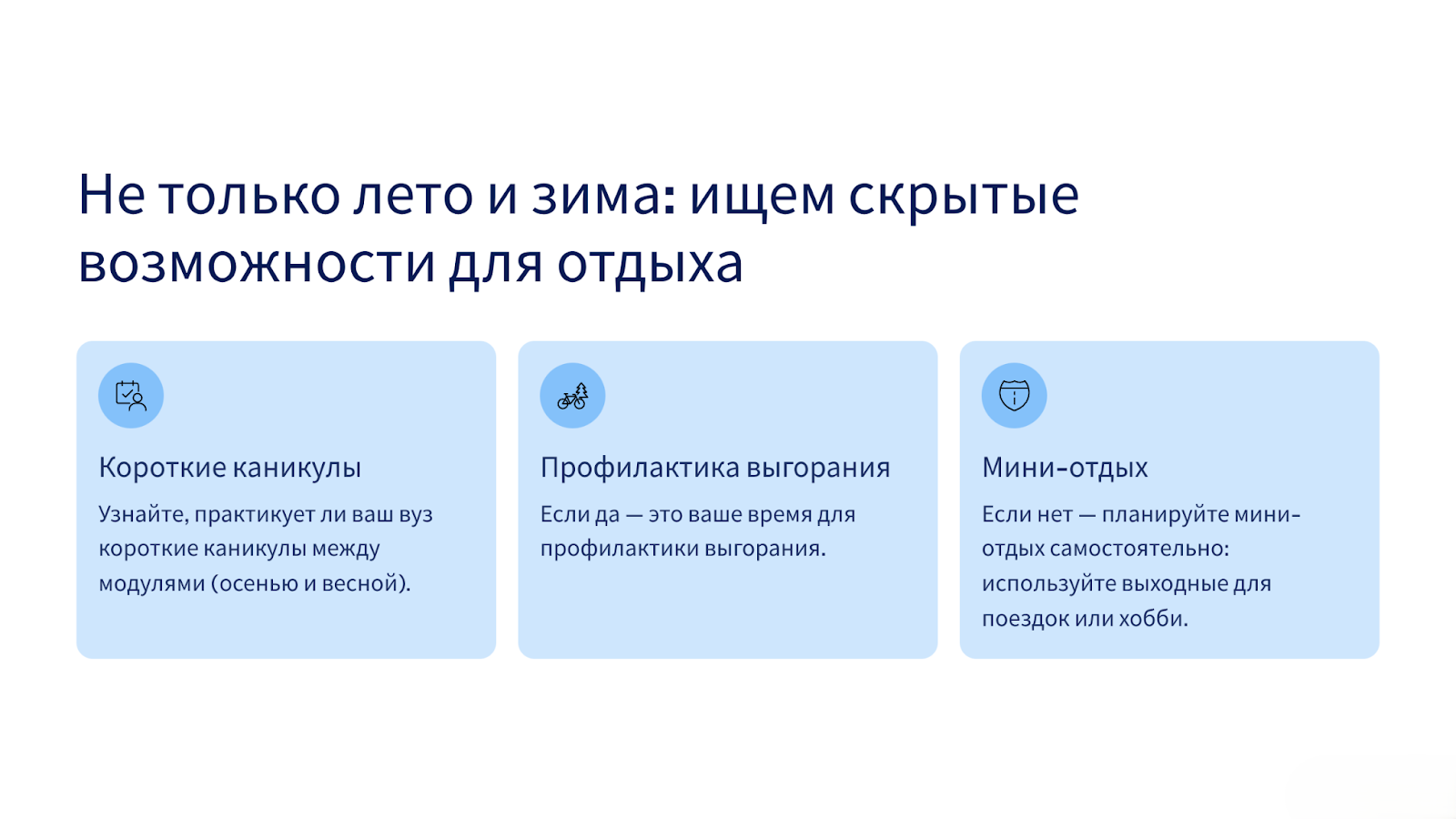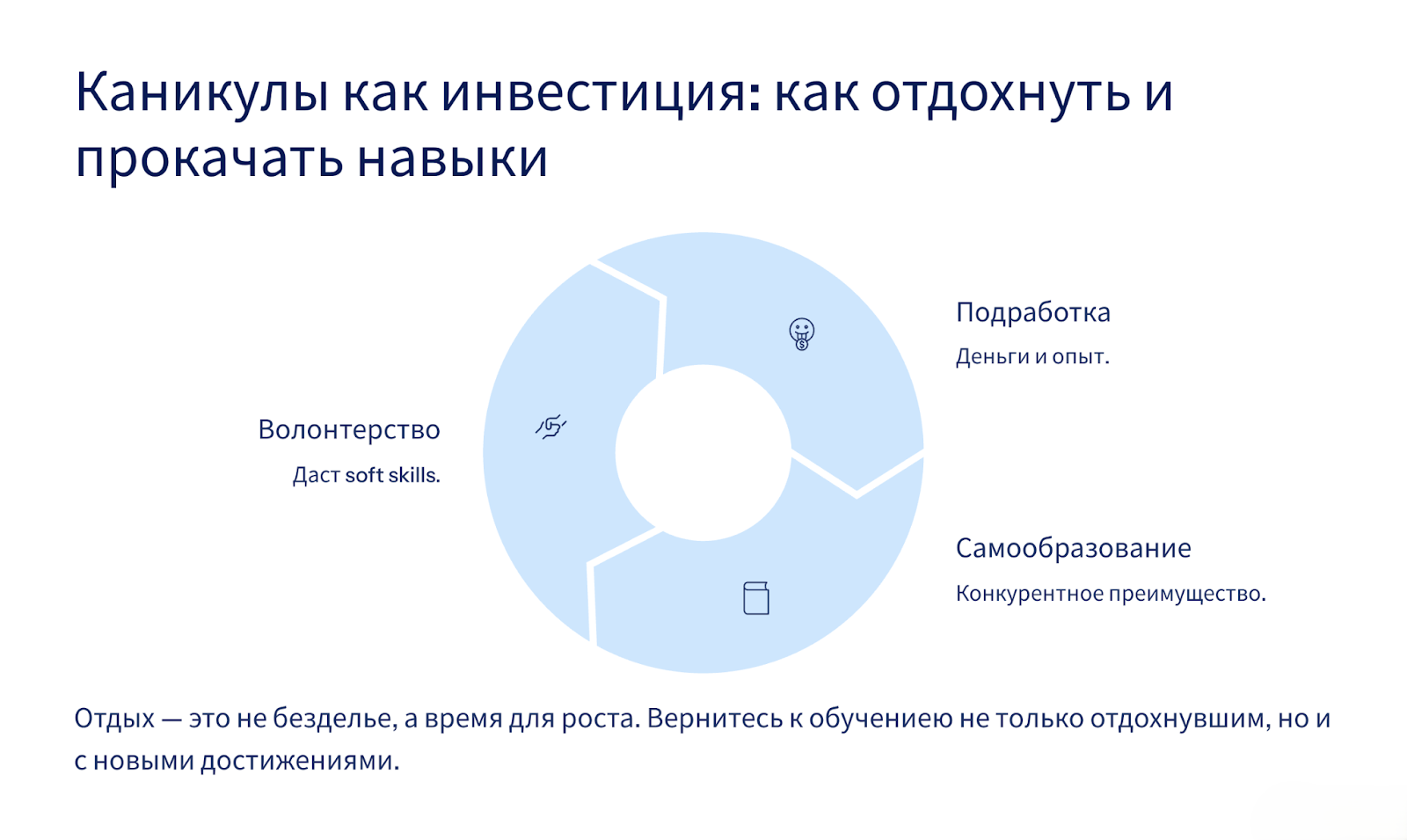 Правильное планирование — залог не только приятного, но и полезного отдыха, который позволит восстановить силы и инвестировать время в собственное развитие. Студенческие каникулы, особенно летние, — один из самых длинных и свободных периодов в жизни, который стоит использовать максимально осмысленно.