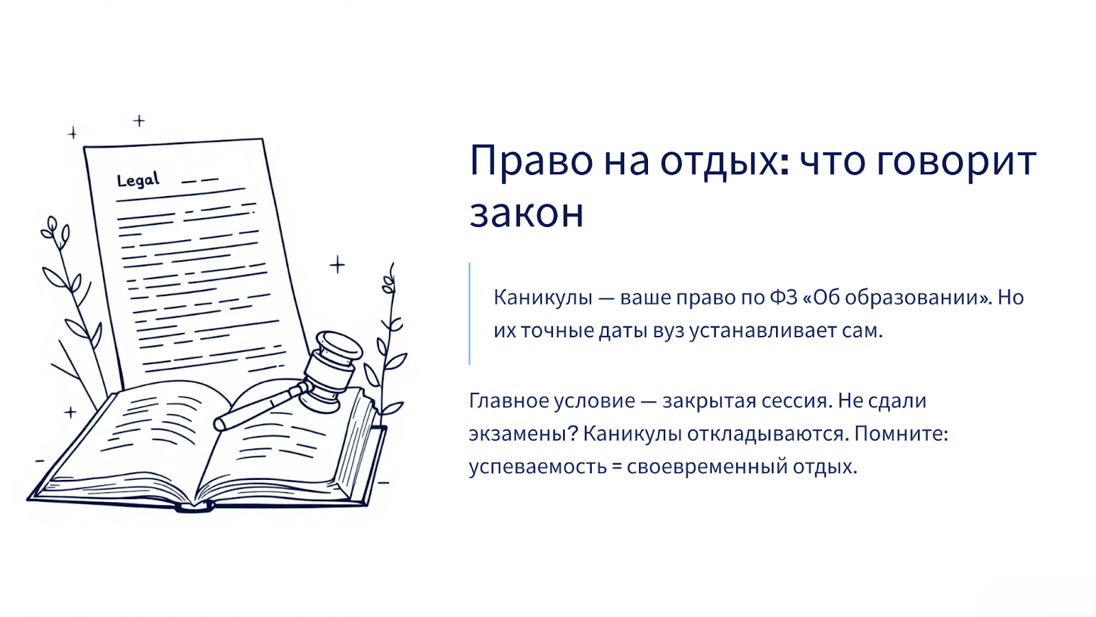 Основным документом, регулирующим этот вопрос, является Федеральный закон «Об образовании в Российской Федерации» (№ 273-ФЗ). В статье 34 он закрепляет право обучающихся на плановые каникулы. Однако закон не устанавливает их точные даты и продолжительность для вузов. Этот вопрос отдан на откуп самим образовательным организациям.