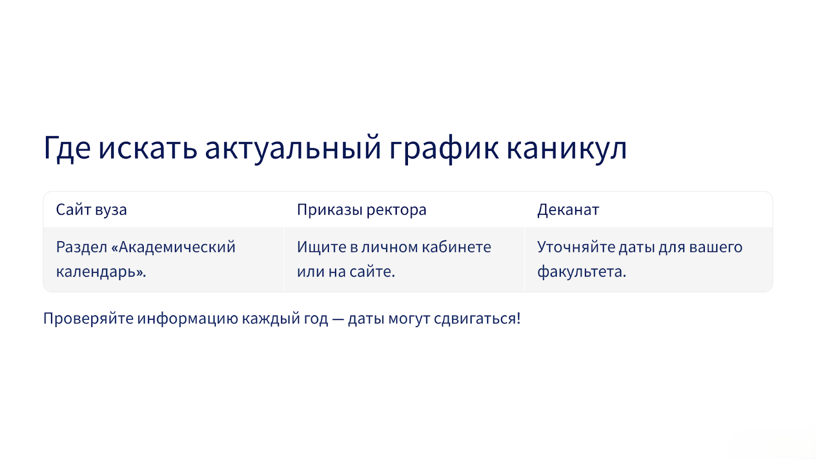 Помимо этого, многие современные вузы, особенно те, что перешли на модульную систему образования (например, НИУ ВШЭ, РАНХиГС и другие), устанавливают дополнительные короткие периоды отдыха. Это так называемые межсессионные «каникулярные паузы» — недельные перерывы между учебными модулями, обычно в середине осеннего и весеннего семестра. По сути, это прямой аналог школьных осенних и весенних каникул. Их главная цель — предотвратить эмоциональное выгорание студентов, дать им возможность передохнуть, переключиться и подтянуть хвосты до начала интенсивной подготовки к экзаменам. Наличие и продолжительность таких пауз необходимо уточнять в учебной части или деканате своего факультета, так как это внутренняя политика учебного заведения.