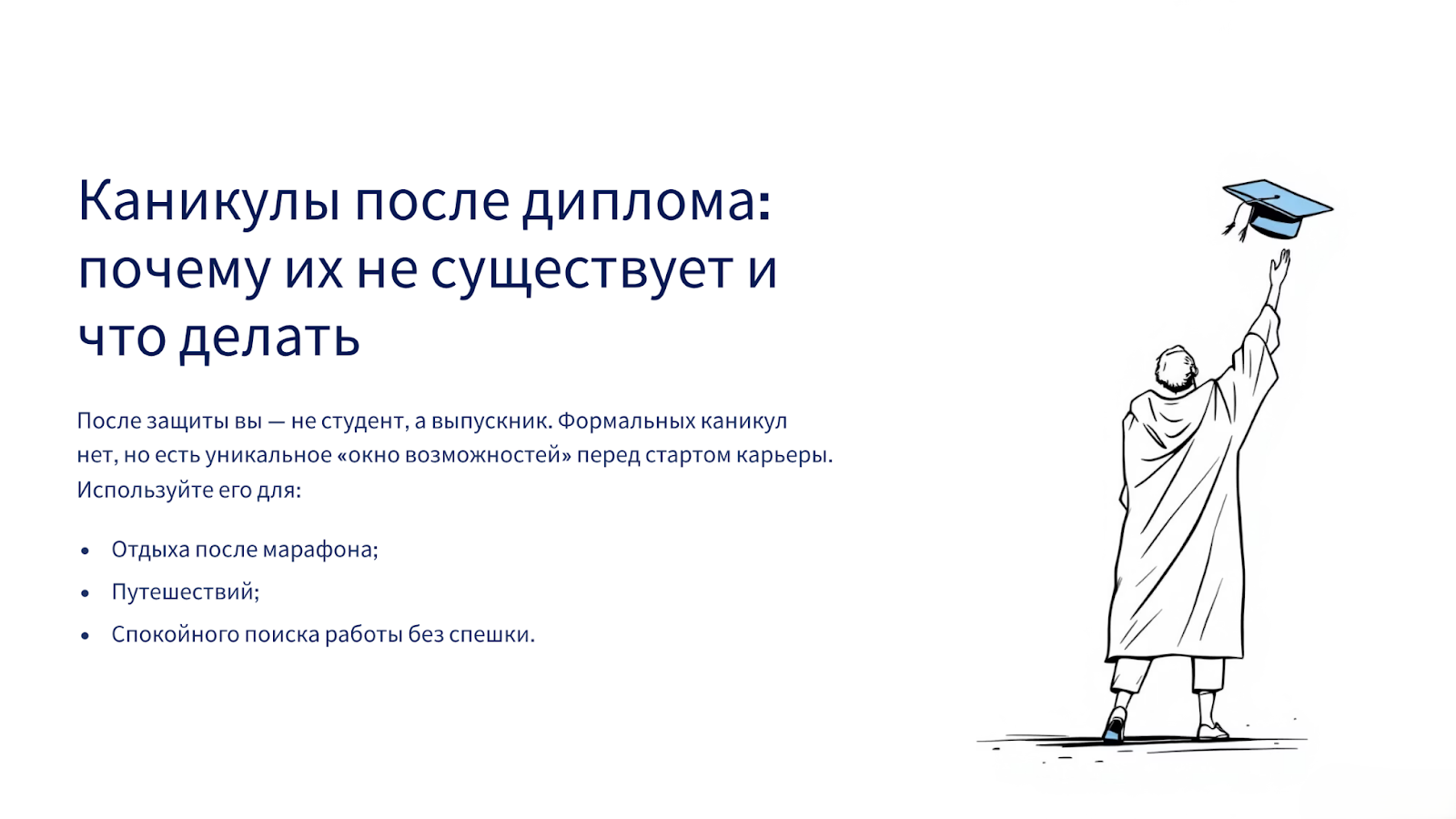 Важно понимать, что с юридической и академической точек зрения понятие «каникулы» после защиты диплома не существует. Каникулы — это плановый перерыв в рамках освоения образовательной программы. Как только вы сдали государственные экзамены и успешно защитили дипломную работу, вы официально завершаете процесс обучения.