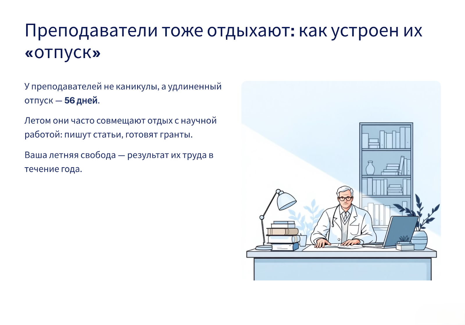 Кроме того, отпуск преподавателя может дробиться и частично использоваться в течение года, например, во время зимних студенческих каникул или в межсессионный период для написания научных статей. Таким образом, пока студенты наслаждаются своим заслуженным отдыхом, их наставники также используют это время для перезагрузки и профессионального развития, что в итоге способствует повышению качества образования в новом учебном году.