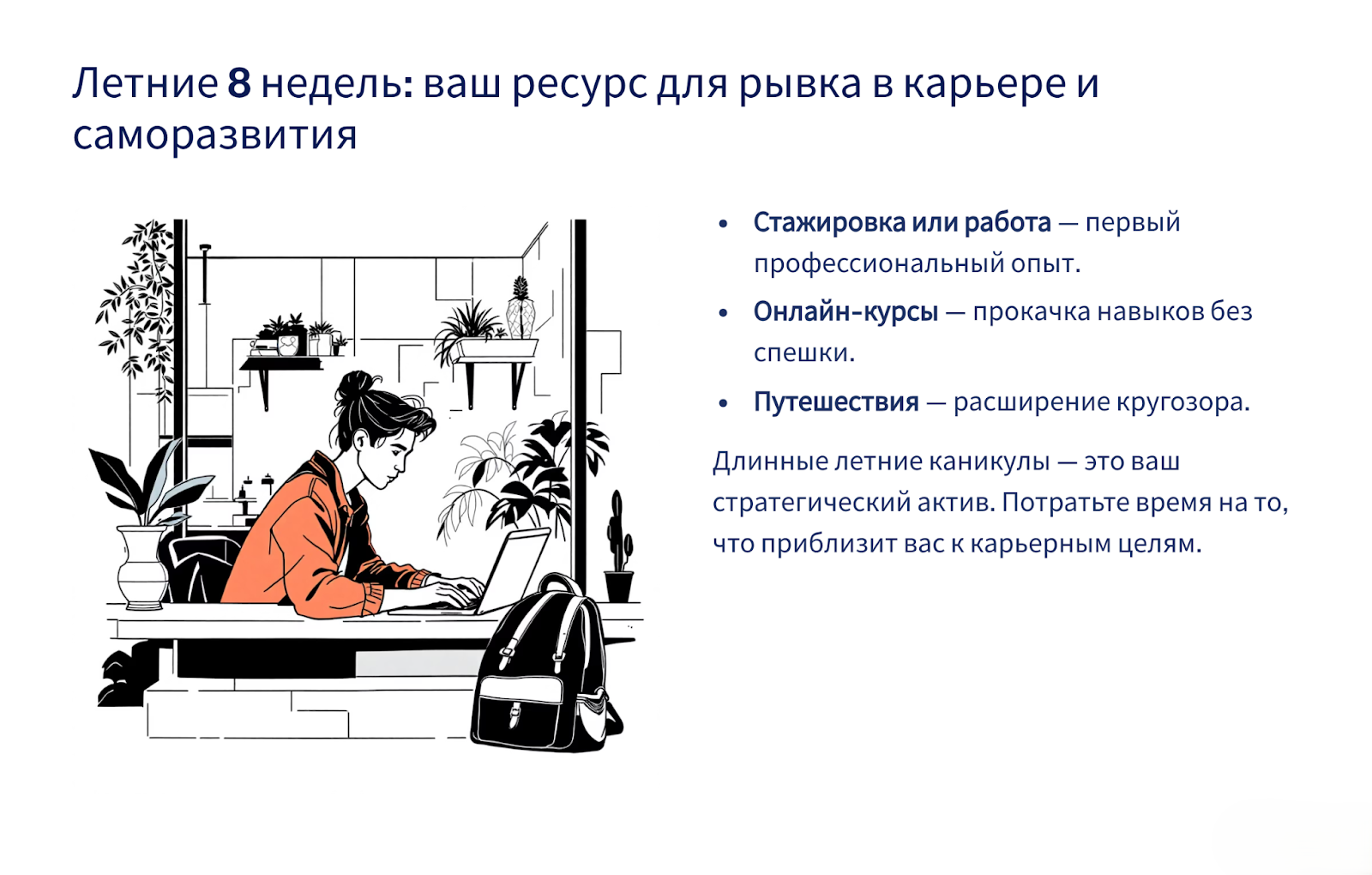 Летние каникулы — это время можно провести с куда большей пользой для будущего. Один из самых популярных и разумных вариантов — найти работу или стажировку по будущей специальности. Даже невысокая позиция или краткосрочный проект дадут вам настоящее представление о профессии, практические навыки и строчку в резюме, которая выделит вас среди других выпускников.