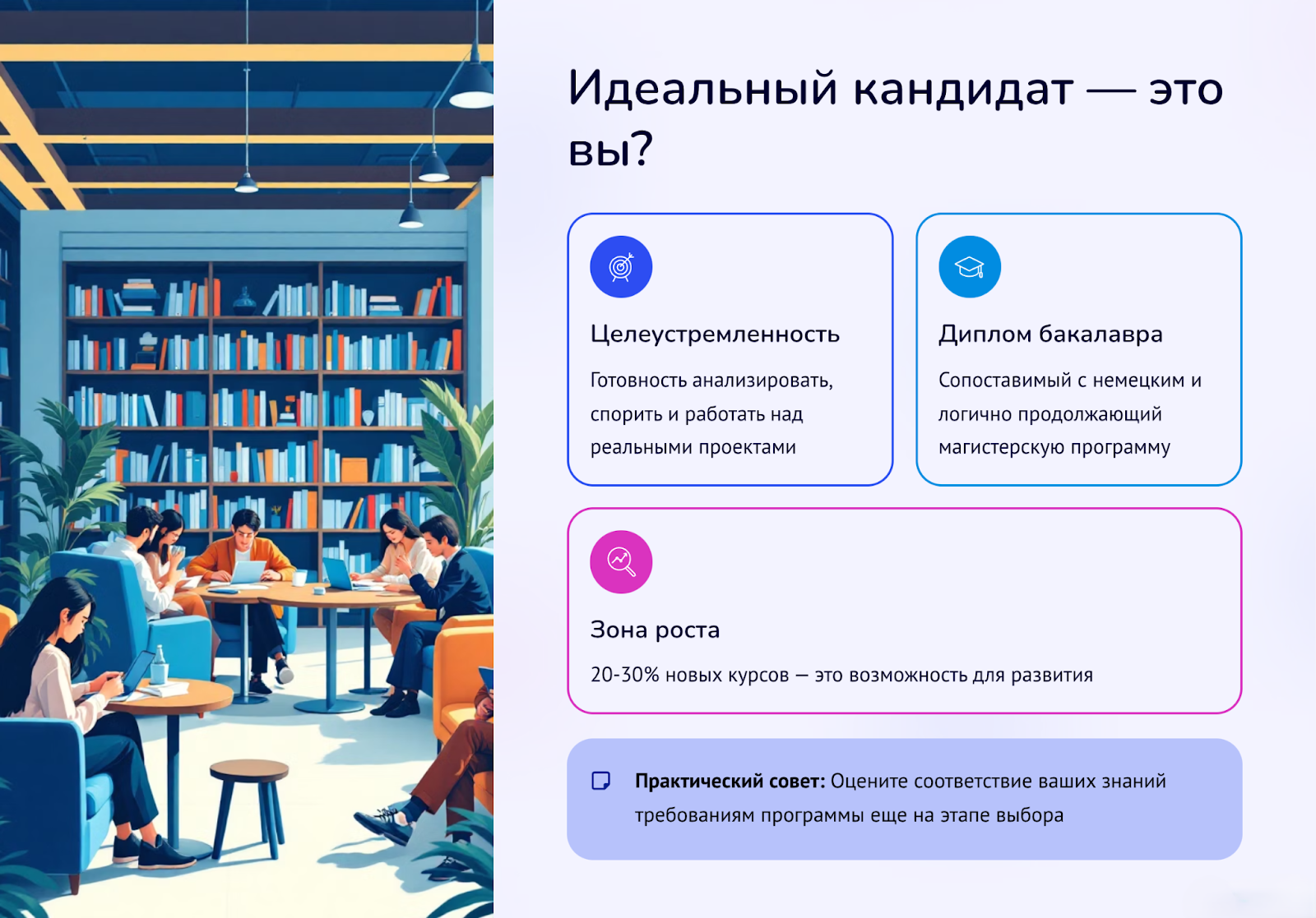 Германия подходит амбициозным и целеустремленным студентам, которые ценят фундаментальные знания, практическую ориентированность и международную среду. Если вы стремитесь к академической свободе, готовы к самостоятельной работе и хотите погрузиться в мультикультурную атмосферу — вам сюда.