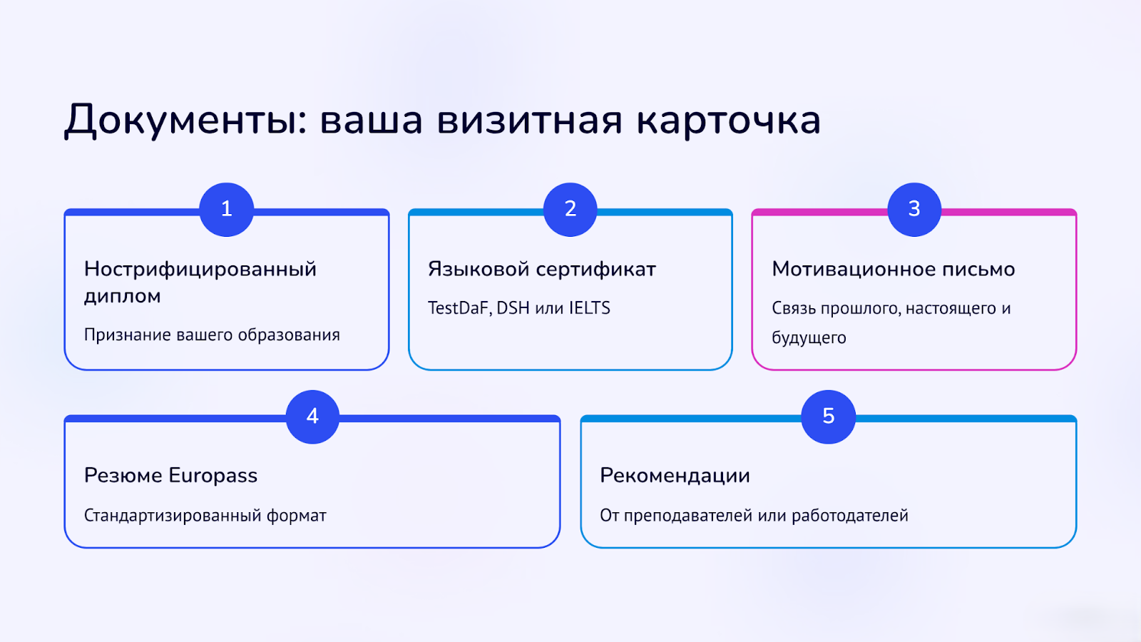 Мотивационное письмо и резюме. Не используйте шаблоны. Письмо должно быть уникальным для каждой заявки. Попросите носителя языка или специалиста проверить текст на ошибки и стилистику.