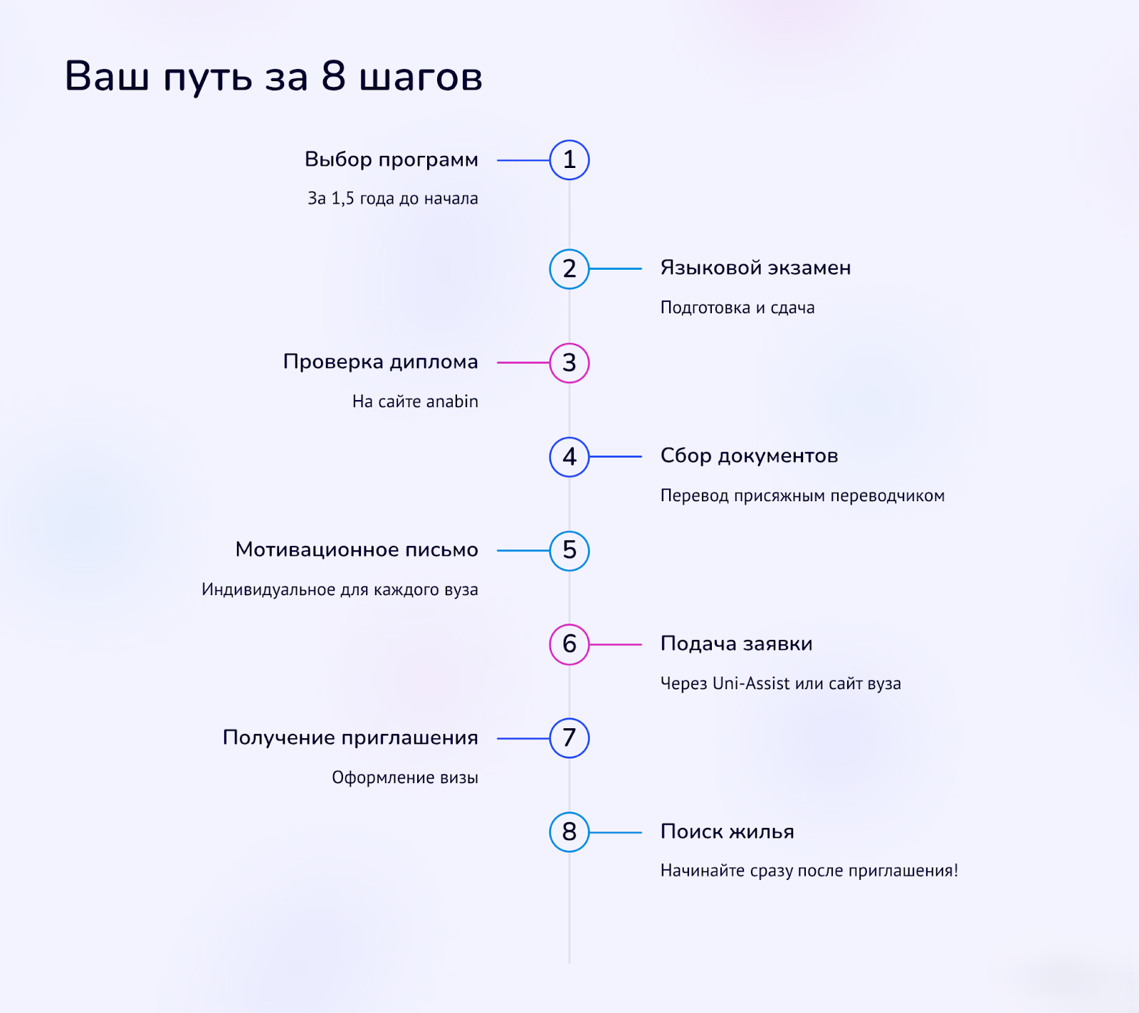 Проверка требований и сроков (за 1 год). Внимательно изучите сайт каждой программы. Сроки подачи документов: на зимний семестр (начало в октябре) — обычно до 15 июля, на летний (начало в апреле) — до 15 января. Некоторые вузы имеют более ранние дедлайны.