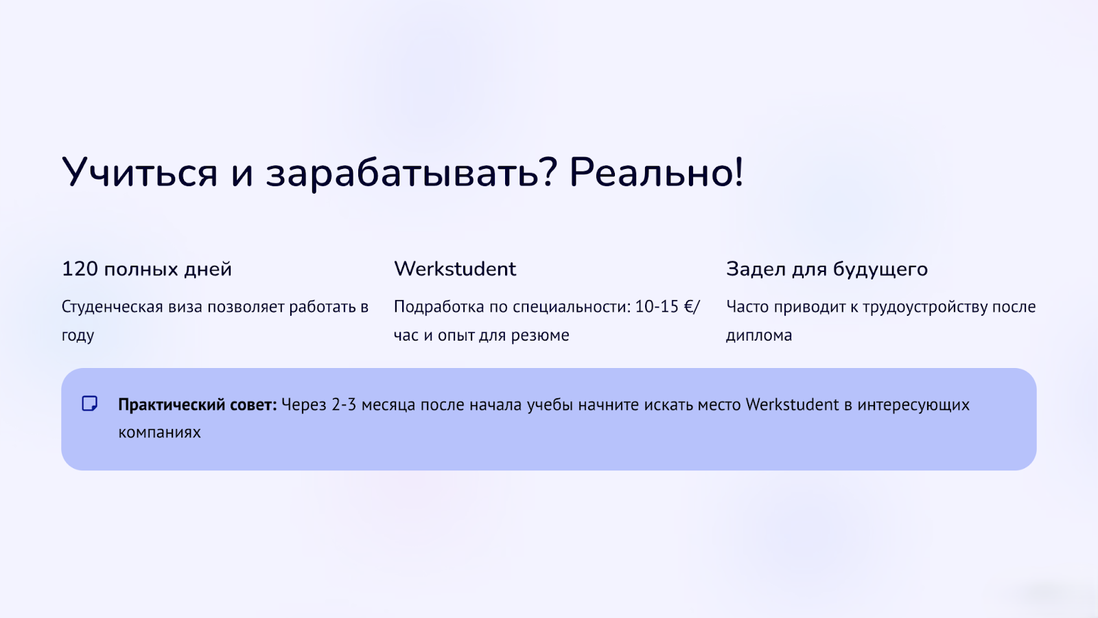 Иностранные студенты имеют право работать 120 полных или 240 неполных дней в году. Это отличная возможность частично покрыть свои расходы и получить ценный опыт. Не стоит рассчитывать, что работа полностью оплатит ваше проживание, но подрабатывать в сферах, связанных с вашей специальностью, очень полезно для резюме. Университеты часто помогают в поиске вакансий через свои карьерные центры.