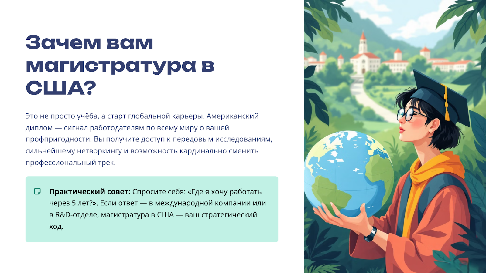 Магистратура в США — это инвестиция в себя, которая требует чёткого понимания целей. Она идеально подойдёт вам, если:
