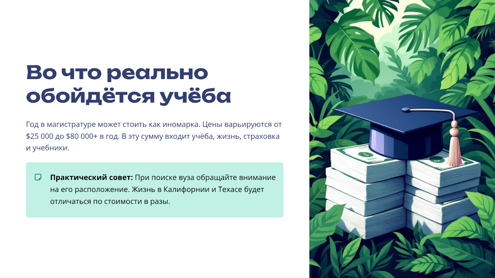 Итого: общая стоимость года магистратуры может составить от 25 000 до 80 000+ долларов.