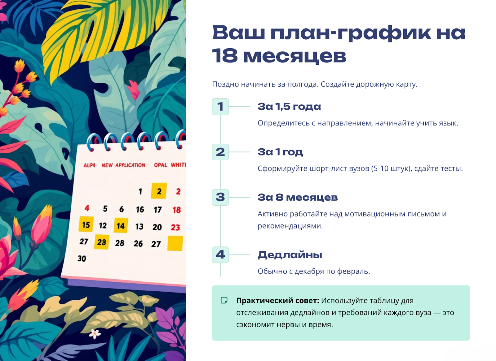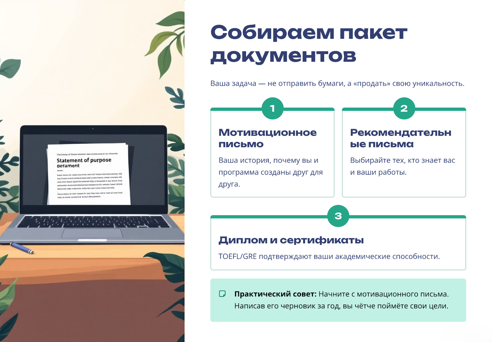 Это долгий и кропотливый процесс, который лучше начинать за 1,5 года до планируемого поступления. Вам потребуется: