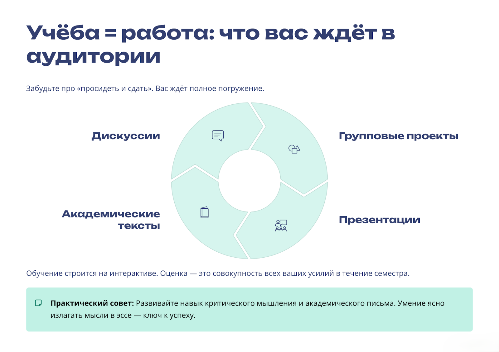 Преподаватель выступает в роли модератора дискуссии, а не единственного источника истины, и от вас ждут аргументированного участия в обсуждении сложных тем.
