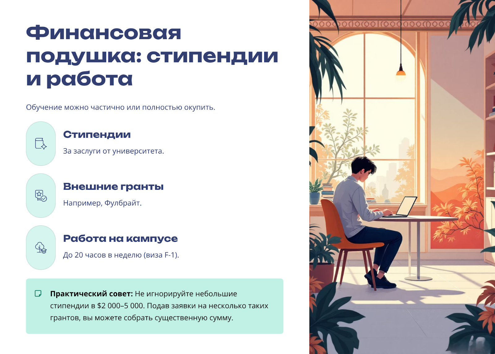 1. Получение полного финансирования. Многие университеты, особенно по исследовательским программам (PhD и некоторые магистерские), предлагают ассистентуры: Teaching Assistantship (TA) или Research Assistantship (RA). Они покрывают стоимость обучения (tuition waiver) и выплачивают ежемесячную стипендию, достаточную для жизни. Это тяжело, но реально, особенно для сильных кандидатов в технических и научных областях.