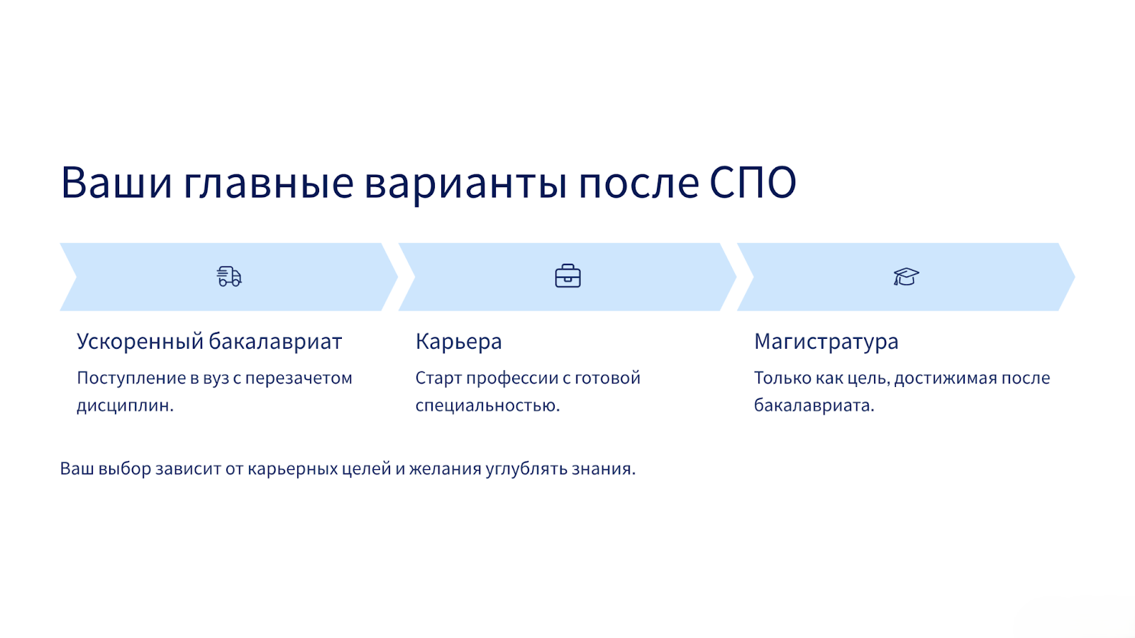 Диплом о среднем профессиональном образовании (СПО) открывает несколько дорог. Классический и самый очевидный вариант — поступление в вуз на программу бакалавриата или специалитета. Чаще всего выпускники колледжа имеют право на ускоренное обучение по индивидуальному плану, так как многие дисциплины могут быть перезачтены.