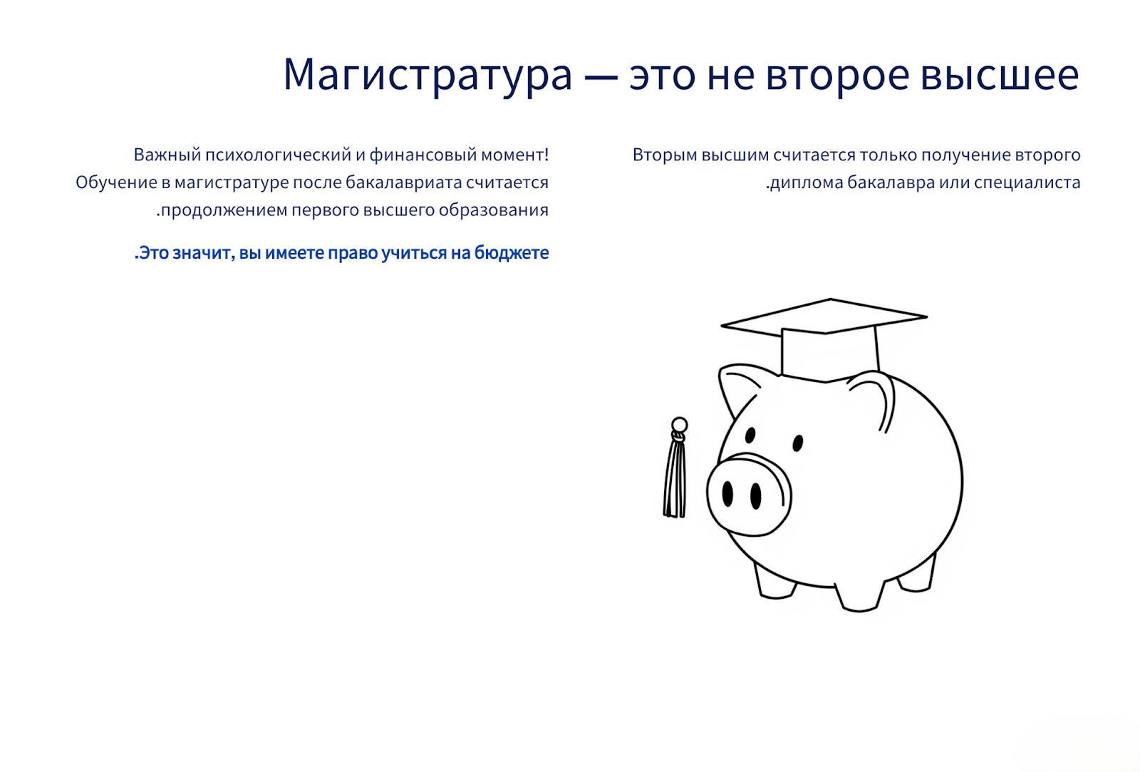Для вас это означает следующее: отучившись на бакалавриате после колледжа и поступив в магистратуру, вы не получаете два отдельных высших образования. Вы получаете одно высшее образование, но с более высокой степенью — магистра. Это важно и с точки зрения процесса обучения: учиться в магистратуре на основании диплома бакалавра вы можете на бюджете, в то время как второе высшее образование почти всегда платное.