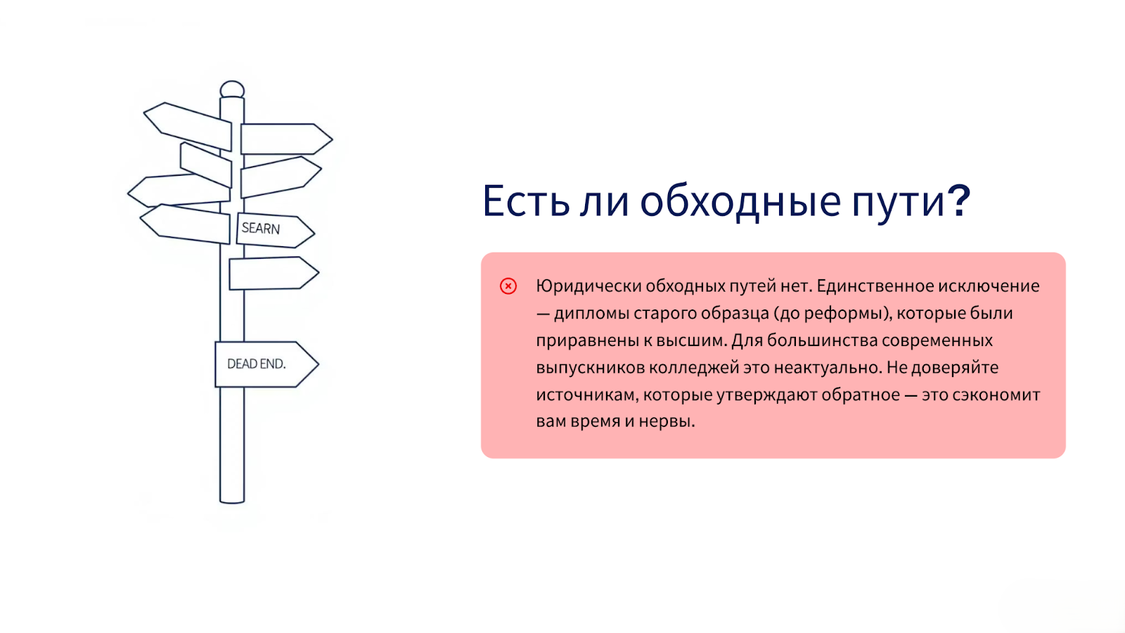 Однако из этого правила есть исключение, которое подтверждает правило. Речь идет о тех, кто получил диплом о высшем образовании до введения Болонской системы (бакалавриат/магистратура), то есть диплом специалиста старого образца. Если у вас, например, диплом о начальном профессиональном образовании (НПО) или СПО, полученный до этой реформы, и он был приравнен к высшему, то у вас есть шанс. Но для подавляющего большинства современных выпускников колледжей это неактуально.