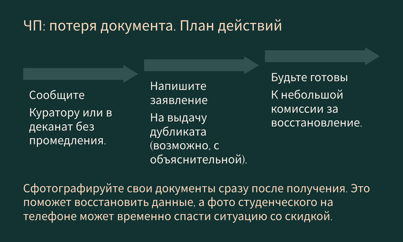 1. Немедленно сообщите о потере своему куратору, старосте группы или сразу в деканат.