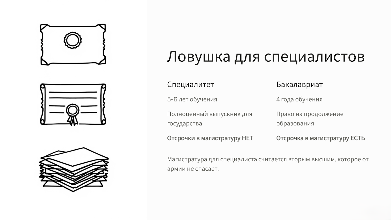 Если вы окончили специалитет (например, по старой системе образования), то поступление в магистратуру не дает права на новую отсрочку. С точки зрения закона, специалитет считается законченным высшим образованием, а магистратура для специалистов приравнивается ко второму высшему, на которое отсрочка не предоставляется. Исключение составляют лишь те, кто поступил в магистратуру сразу после специалитета, не получив диплом, но на практике это почти невозможно.