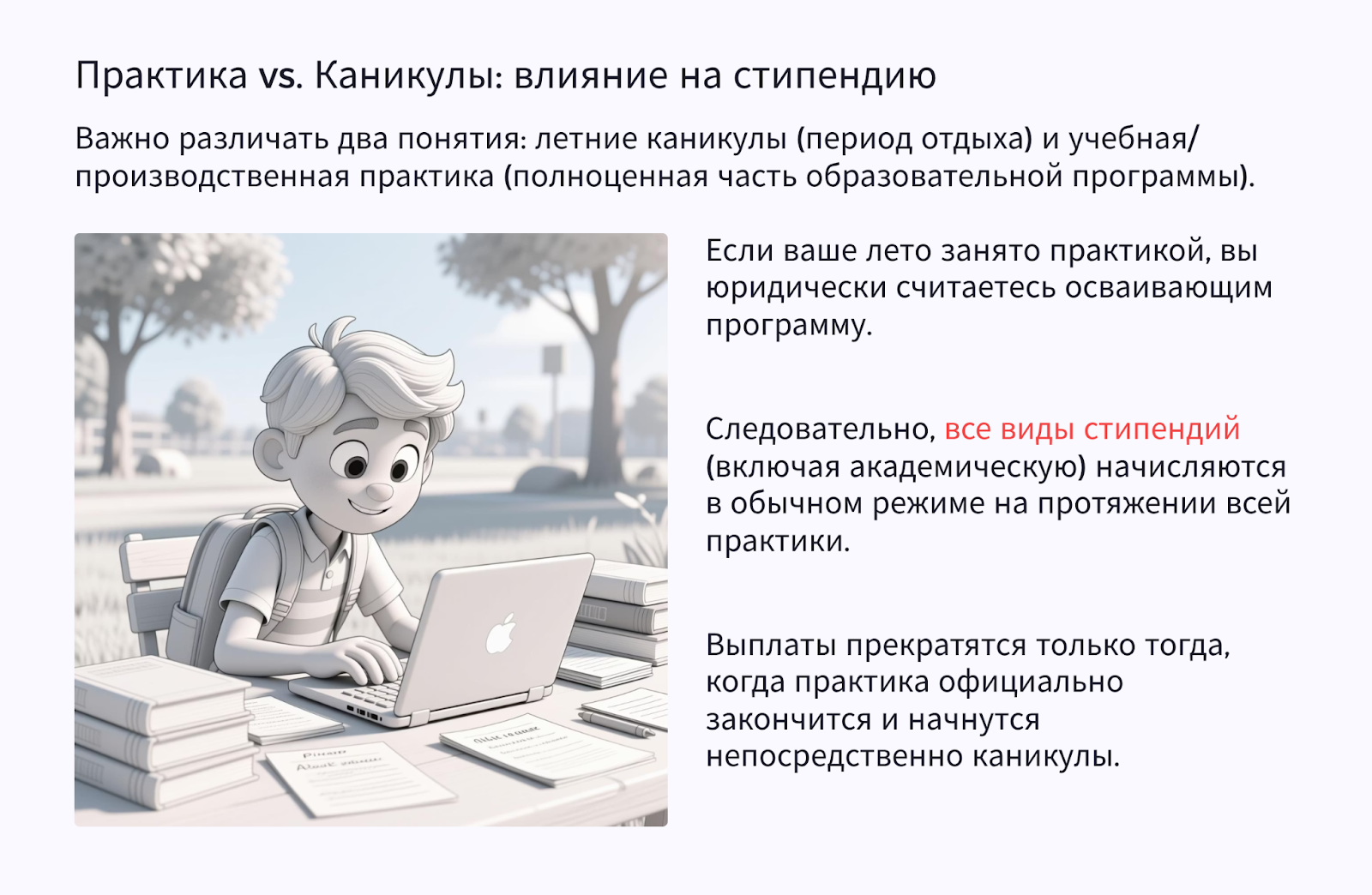 — Практика — это не каникулы. Учтите, что если ваша учебная программа включает летнюю практику, то этот период официально считается частью образовательного процесса, а не каникулами. На это время все положенные вам стипендии продолжают начисляться в стандартном режиме.