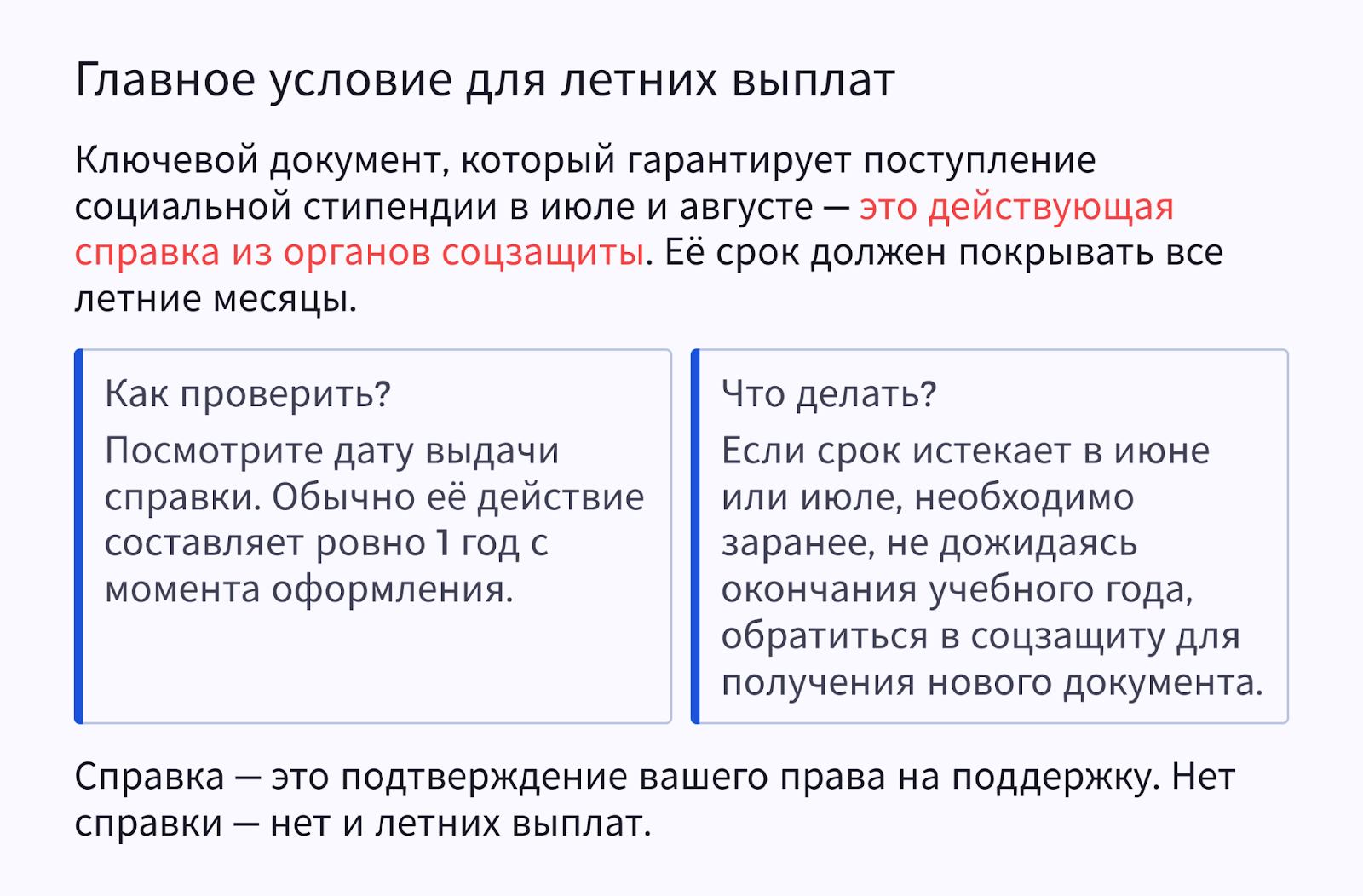 — Если срок действия вашей справки покрывает летние месяцы, то вы будете гарантированно получать социальную стипендию и в июне, и в июле, и в августе.