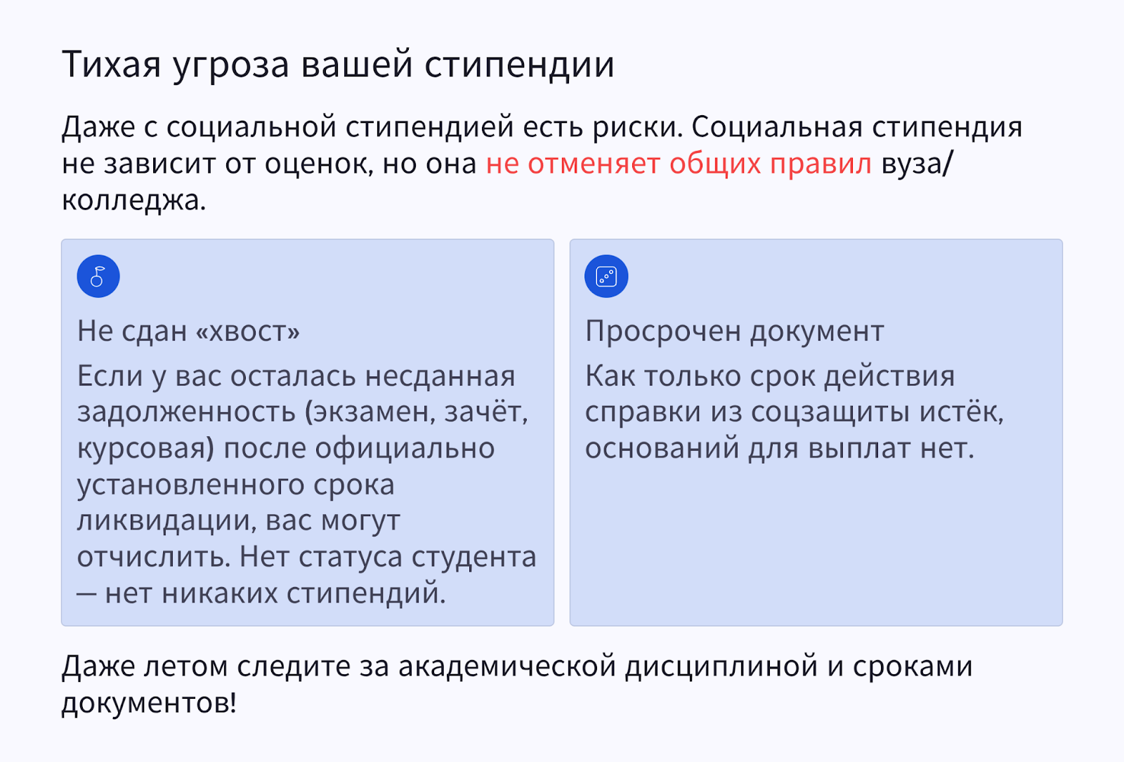 — Важный нюанс! Если вы предоставили справку, например, в сентябре 2023 года, то она действует до сентября 2024 года. Стипендия будет назначаться вам на весь этот период, включая лето 2024 года.