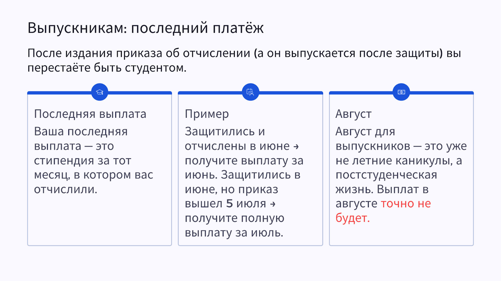 — Если приказ об отчислении издан 30 июня, то последняя стипендия, которую вы получите, будет за июнь. Выплаты за июль и август вам уже не положены.