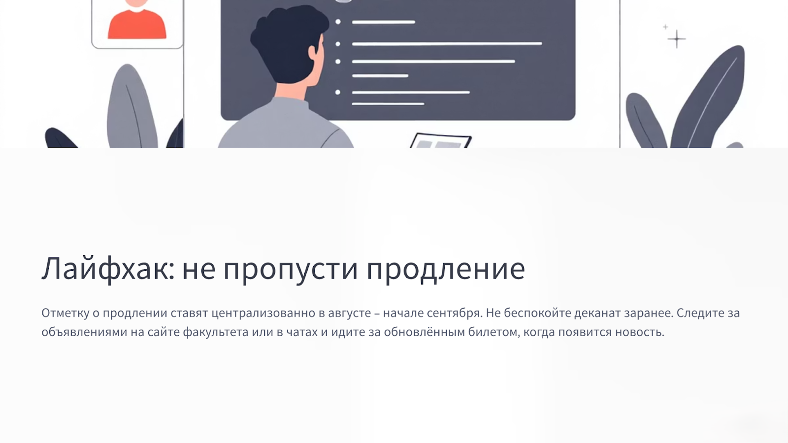 Обычно деканаты начинают массово ставить отметки о продлении в августе. К началу сентября большинство студентов уже имеют обновлённые билеты.